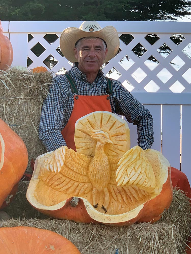 Wearing signature orange overalls and a straw hat, “Farmer Mike” is a cornerstone of the Half Moon Bay Art and Pumpkin Festival. For almost four decades, festival attendees have flocked to his elevated stage to watch in awe as Farmer Mike, the Pumpkin Picasso, meticulously sculpts giant pumpkins into works of art.