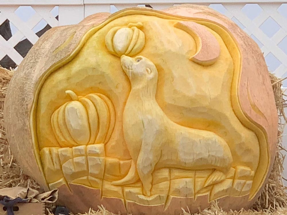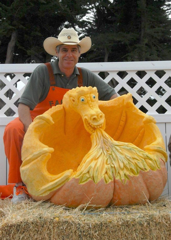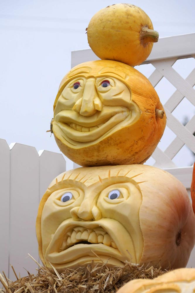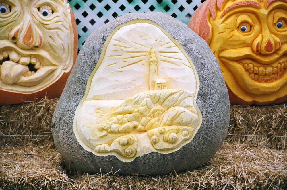 These are not your average jack-o-lanterns. The Atlantic Giant variety of pumpkins he carves range in size from a hundred pounds to more than a half ton each. Because giant pumpkins have a thicker shell, he takes advantage of the size and depth of the medium to create whimsical faces and reliefs that defy imagination.