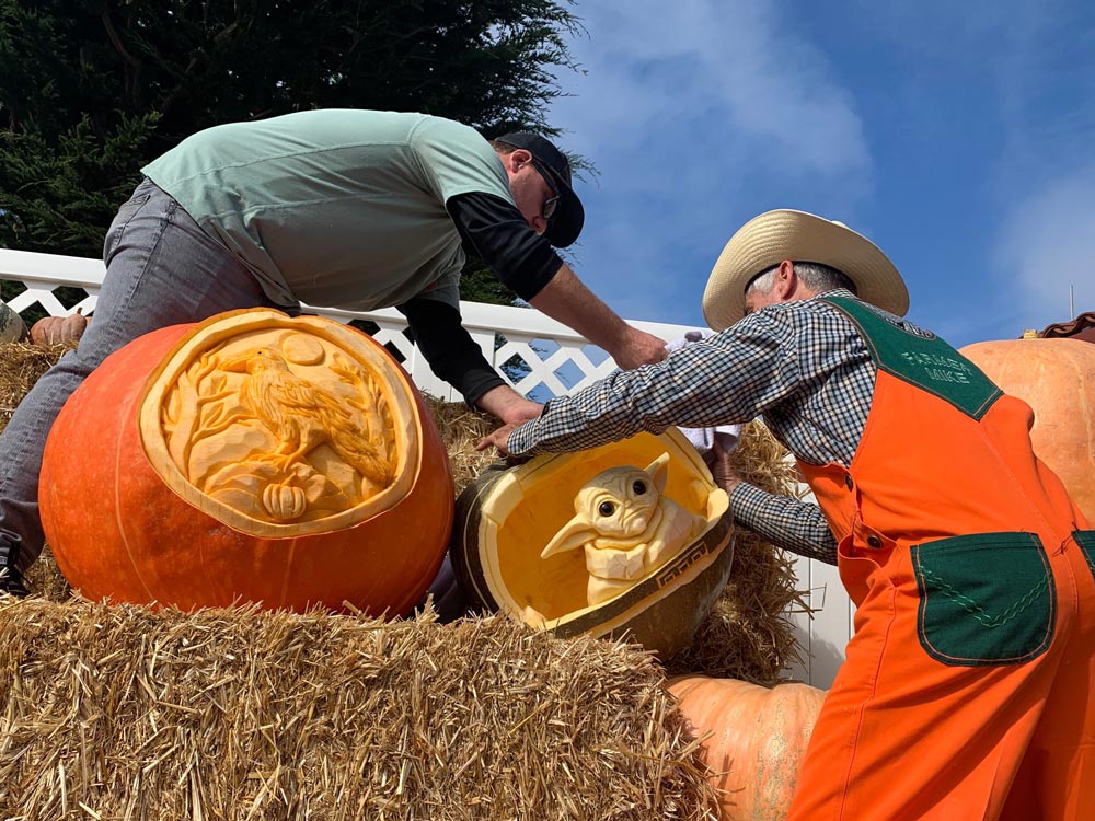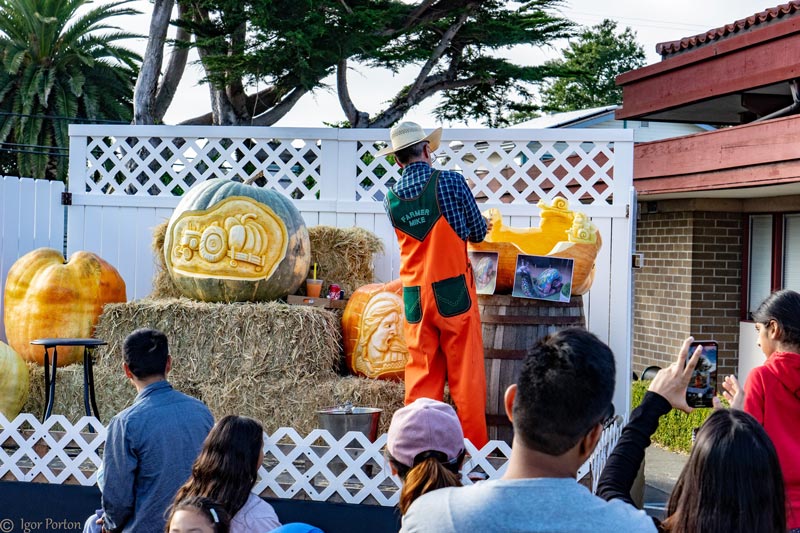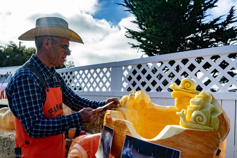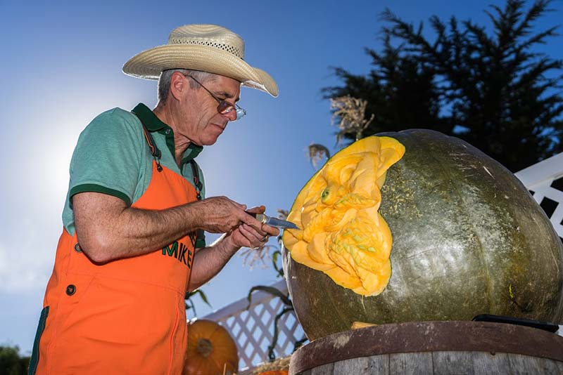 Wearing signature orange overalls and a straw hat, “Farmer Mike” is a cornerstone of the Half Moon Bay Art and Pumpkin Festival. For almost four decades, festival attendees have flocked to his elevated stage to watch in awe as Farmer Mike, the Pumpkin Picasso, meticulously sculpts giant pumpkins into works of art.